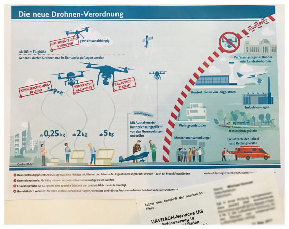 Die Einhaltung der Rechtsvorschriften ist uns im Einsatz der Technik sehr wichtig. Somit verfügen wir neben einem Flugpraxiszeugnis auch über den notwendigen Kenntnisnachweis.